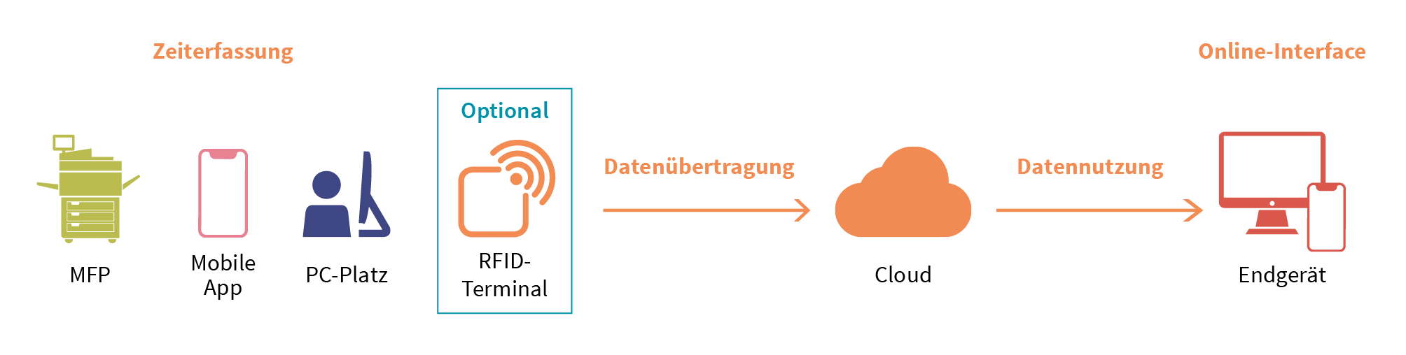 UTAX Zeitblick macht das Erfassen von Arbeitszeiten einfach. Sobald die Software im Multifunktionsprinter installiert ist, kann jede Mitarbeiterin und jeder Mitarbeiter den eigenen Arbeitsbeginn und das Ende der Arbeitszeit verlässlich festhalten – geradezu im Vorbeigehen. Und wenn es nicht der Bürodrucker sein soll: UTAX Zeitblick funktioniert ebenso problemlos am PC-Arbeitsplatz oder per Smartphone-App.